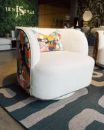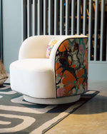 The Dineo Swivel Chair is a striking, contemporary accent piece that adds flair to any room. Featuring the artistry of Christian Lacroix on the out-back, this barrel-style chair combines comfort and modern design. Its curved backrest offering a natural contrast to the vibrant fabric upholstery. With a built-in swivel function, it provides both style and flexibility, perfect for living rooms, bedrooms, or offices.
